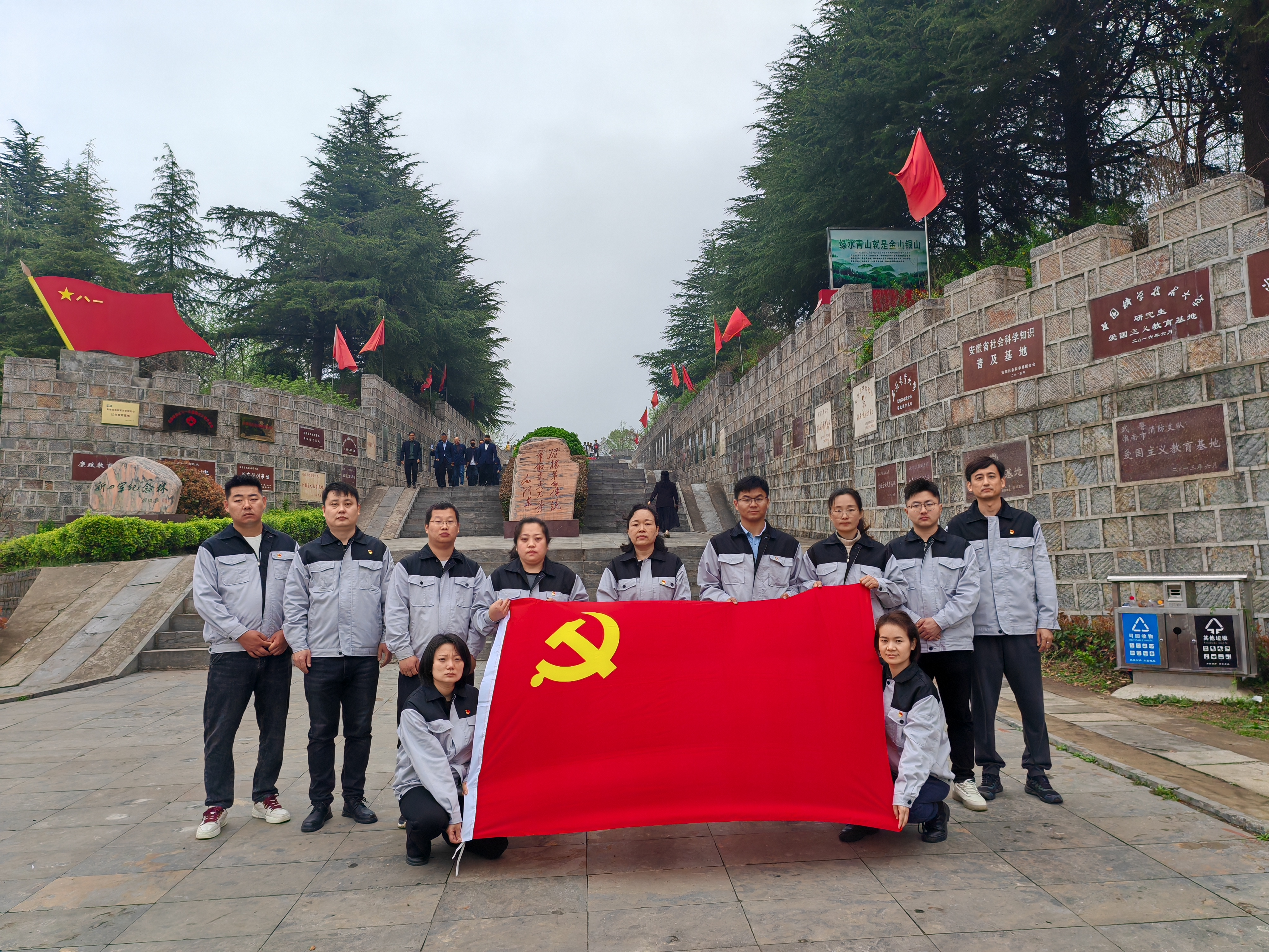細(xì)雨綿綿、微風(fēng)拂面,大家統(tǒng)一身著灰色工作服,拾級(jí)而上,首先來(lái)到了“淮南市烈士陵園”,懷著深深的敬意向革命烈士們默哀并敬獻(xiàn)了花籃;然后在“新四軍精神永放光芒”紀(jì)念碑前肅立、敬獻(xiàn)花束,瞻仰兩側(cè)石壁上鐫刻著的新四軍歷次重大戰(zhàn)役和重要事件的石碑;最后在“南方三年游擊戰(zhàn)爭(zhēng)紀(jì)念園”駐足停留,深切感受革命先烈在艱苦卓絕的戰(zhàn)爭(zhēng)歲月里百折不撓、浴血奮戰(zhàn)、甘于犧牲的偉大革命精神。